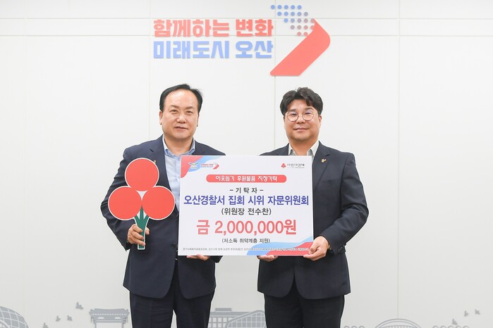 경기 오산시는 최근 오산경찰서 집회시위 자문위원회로부터 저소득 취약계층 지원을 위한 성금 200만원을 기탁받았다. 사진은 기탁식에서 이권재 시장(왼쪽)이 관계자와 기념 촬영을 하는 모습. (사진=오산시청 제공)