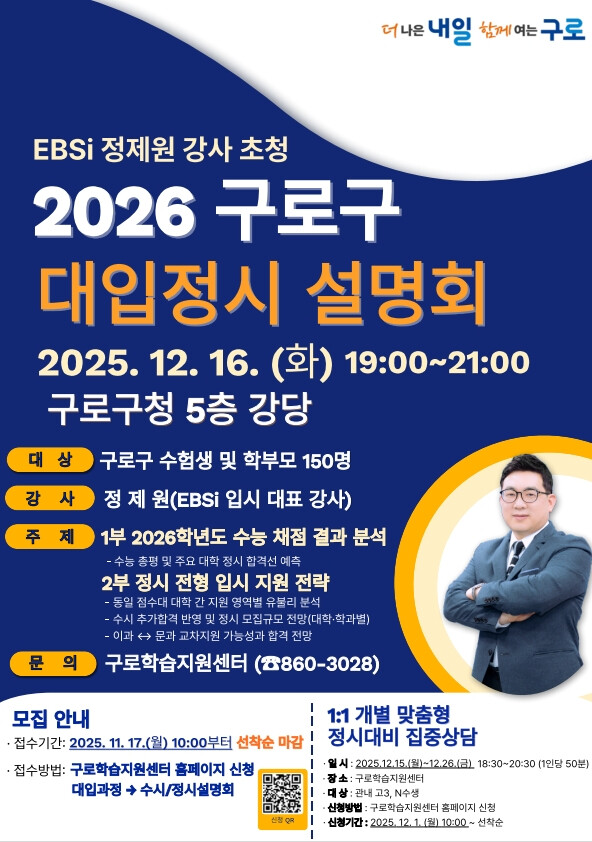 먼저 구는 오는 16일 오후 7시 구청 강당에서 ‘2026 구로구 대입 정시 설명회’를 개최한다. 지역내 수험생과 학부모 150명을 대상으로 정제원 EBS 대표 강사가 진행한다.