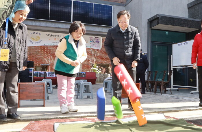 서울 금천구 독산1동에서 최근 정월대보름을 앞두고 금하마을 주민협의체와 자원봉사캠프가 문화행사를 개최하고 찰밥과 나물 등 음식을 나눴다. 사진은 유성훈 구청장(오른쪽)이 주민들과 윷놀이를 하고 있는 모습. (사진=금천구청 제공)