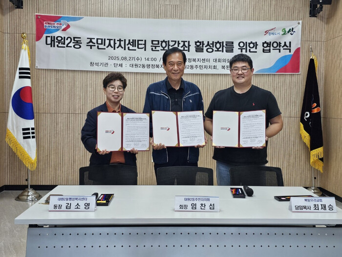 경기 오산시 대원2동 주민자치회는 27일 대원2동 행정복지센터 대회의실에서 복된우리교회와 문화강좌 운영을 위한 업무협약(MOU)을 체결했다. 사진은 관계자들이 기념 촬영을 하는 모습. (사진=오산시청 제공)