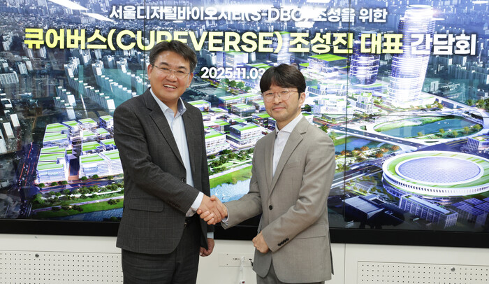 오승록 서울 노원구청장이 최근 구청장실에서 조성진 큐어버스 대표와 간담회를 하고, ‘서울 디지털바이오시티(S-DBC)’ 조성을 위한 협력방안을 논의했다. 사진은 오 구청장(왼쪽)이 조 대표와 기념 촬영을 하는 모습. (사진=노원구청 제공)