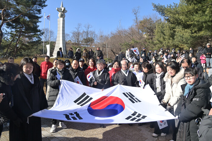 서울 중구가 지난 1일 오전 9시30분 장충동 3.1독립운동기념탑에서 삼일절 기념행사를 열었다. 사진은 이날 행사에 참석한 김길성 중구청장(가운데)과 참여자들이 태극기를 들고 있는 모습. (사진=서울 중구청 제공)