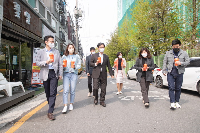 | ▲ 이재현 구청장(가운데)이 다회용컵을 들고 구청 직원들과 함께 걷고 있다. (사진제공=인천 서구청) |