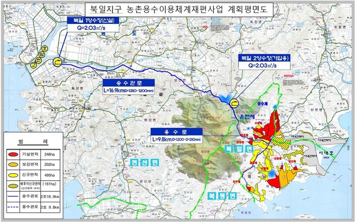 | ▲ 북일지구 농촌용수이용체계재편사업 계획 평면도 / 한국농어촌공사 해남·완도지사 제공 |