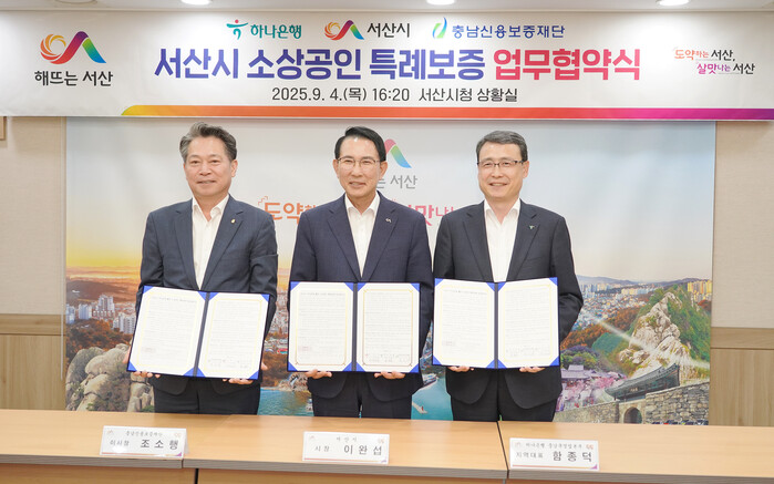 이날 협약식에는 이완섭 시장, 함종덕 하나은행 충남북영업본부 대표, 조소행 충남신용보증재단 이사장 등이 참석했다.