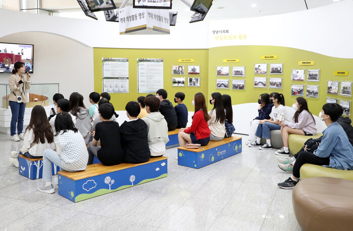 학생들은 성남시의회 홍보관을 관람하면서 시의회의 역할과 기능, 시의원이 하는 일에 대하여 견학진행자의 설명을 들었다. 이어서 방문한 본회의장에서는 회의가 진행되는 과정에 관한 영상을 시청한 후 발언대와 의원석 등의 주요 시설물에 대해 배우고 실제 회의 상황을 체험하였다.