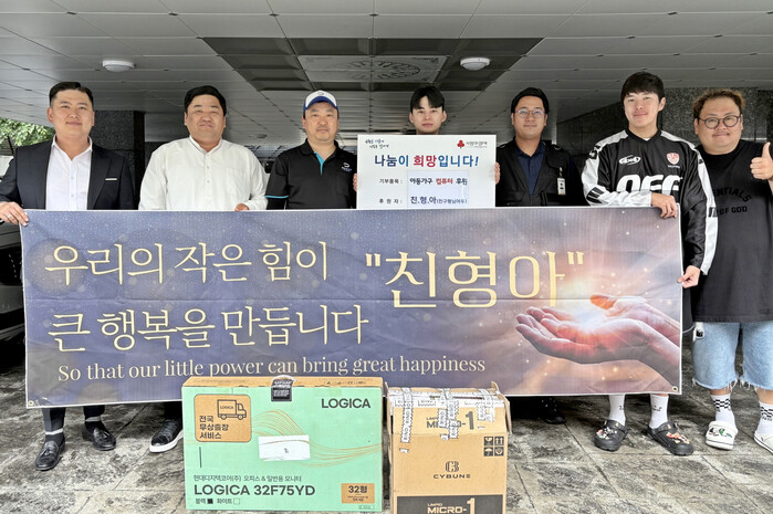 자원봉사단체 친형아가 최근 경기 수원시 권선구 세류2동에서 복합적 위기상황으로 사례관리 중인 저소득층 아동가구 대상으로 기부 물품을 전달했다. 사진은 전달식에 참석한 관계자들이 기념촬영을 하고 있는 모습. (사진=권선구청 제공)