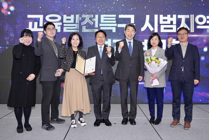 [광주=정찬남 기자] 강기정 광주광역시장(사진 가운데)이 20일 홀리데이인 광주호텔에서 열린 ‘교육발전특구 시범지역 운영 성과보고회’에 참석해 참석자들과 기념사진을 촬영하고 있다. /광주광역시 제공