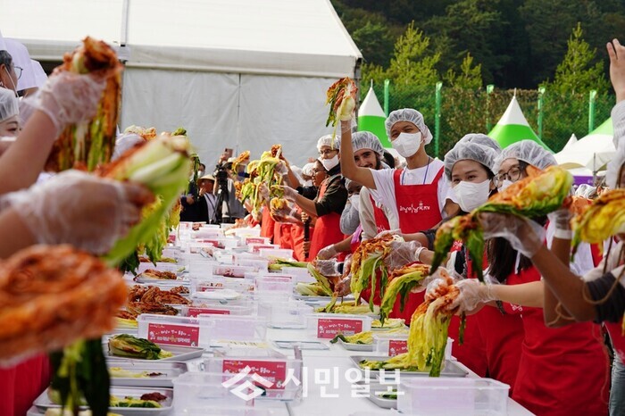 | ▲ 외국인 관광객들, 해남미남축제 행사 기간 중 515김치비빔 체험 자료사진 / 해남군 제공 |