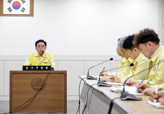 서울 강서구가 진교훈 구청장을 비롯한 부구청장, 국장 등 20여명의 간부들이 참여한 가운데 25일 발생한 하수관 공사 현장 근로자 사망 사고와 관련해 같은 날 오후 3시30분 긴급 비상 대책회의를 개최했다. 사진은 진 구청장(왼쪽)이 회의를 주재하는 모습. (사진=강서구청 제공)