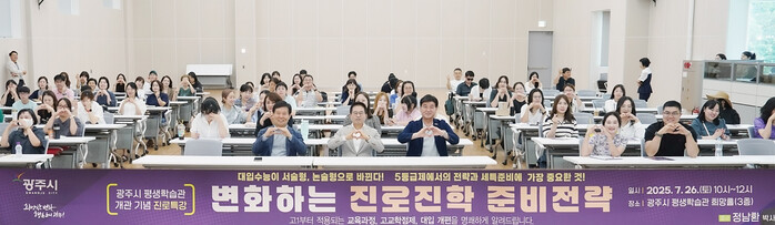 경기 광주시가 최근 광주시평생학습관에서 지역내 학생 및 학부모 100여명을 대상으로 ‘2025년 진로 특강’을 개최했다. 사진은 특강에 참석한 방세환 시장(앞줄 오른쪽 세 번째)이 관계자들과 기념 촬영을 하는 모습. (사진=광주시청 제공)