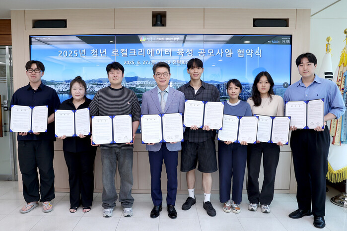 서울 성동구가 최근 구청 7층 전략회의실에서 '청년 로컬크리에이터 육성 공모사업'에 선정된 7개 단체와 업무협약을 체결했다. 사진은 정원오 구청장(왼쪽 네 번째)이 협약서를 들고 기념 촬영을 하는 모습. (사진=성동구청 제공)