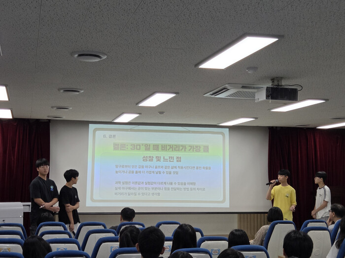 1학년 학생들은 선배들의 발표를 경청하며 탐구 주제를 구상하는 시간을 가졌고, 2학년 학생들은 △과학·수학적 탐구 △AI 및 소프트웨어 활용 △환경·에너지 문제 해결 △인문·사회 융합 프로젝트 등 다양한 분야에서 연구 성과를 발표했다.
