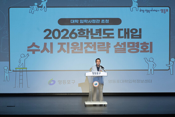 서울 영등포구가 지난 26일 영등포아트홀에서 2026학년도 대입 수시지원 전략 설명회를 진행했다. 사진은 설명회에 참석한 최호권 구청장이 인사말을 하고 있는 모습. (사진=영등포구청 제공)