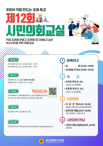 「시민 의회교실」은 시민에게 다소 멀게 느껴지는 지방의회에 대한 관심과 인식 고취를 위해 2011년부터 매년 개최하고 있으며, 해마다 전반적인 의정 상황 설명, 의회시설 견학, 의정 체험 순으로 진행되어 왔다.
