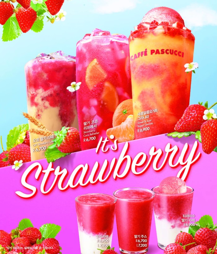 파스쿠찌는 ‘It’s Strawberry(내 공간이 딸기로 가득해지는 순간)’를 콘셉트로 제철 과일 딸기가 더욱 돋보일 수 있는 제주 감귤, 귀리 우유, 요거트 젤라또 등의 재료를 활용해 다채로운 음료와 디저트 메뉴들을 선보인다.