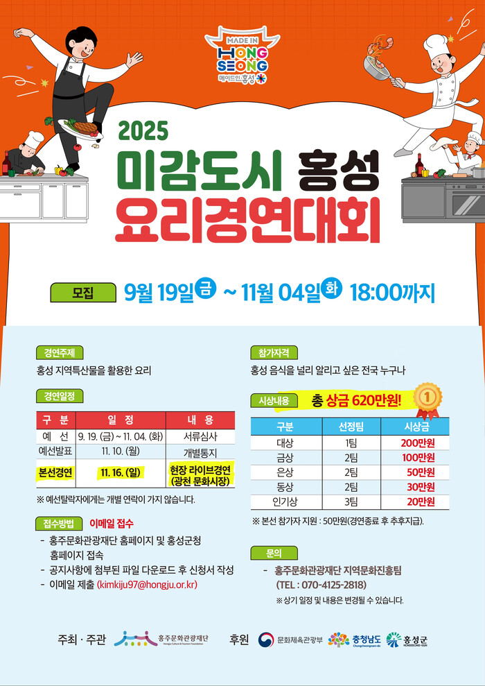 [홍성=최복규 기자] 충남 홍성군은 오는 11월4일까지 ‘2025년 미감도시 홍성 요리경연대회’의 참가자를 추가 공개 모집한다고 밝혔다.