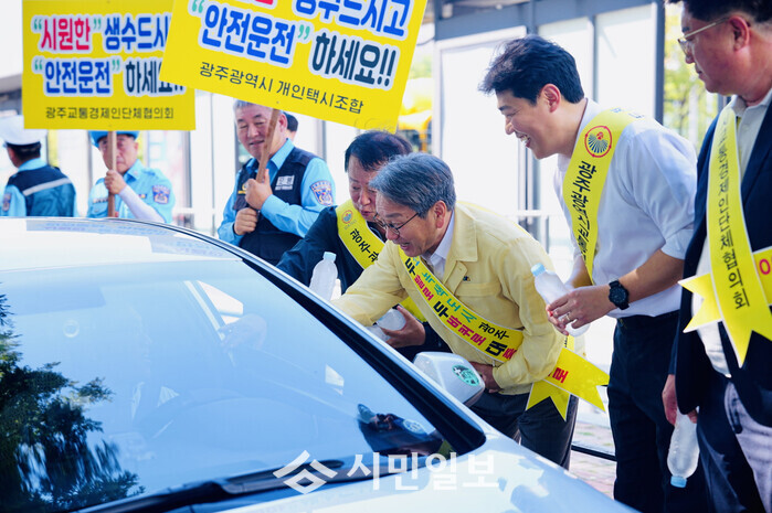 [광주=정찬남 기자] 강기정 광주광역시장이 29일 오후 유스퀘어 광장 앞 시내버스 택시 하차장에서 연일 폭염으로 고생하는 운수종사자에게 생수를 전달하고 있다. 이날 캠페인은 (사)광주교통경제인단체협의회가 주최·주관했으며 협의회 회원, 버스조합, 개인택시조합 관계자 등 30여명이 참석했다. /광주광역시 제공