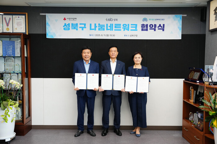 서울 성북구가 11일 성북복지재단, 서울사회복지공동모금회와 함께 ‘성북구 나눔네트워크’ 협약(MOU)을 체결했다. 이번 협약은 기부 문화를 활성화하고, 민간의 자율성과 전문성, 행정력의 결합을 통해 실질적인 복지서비스를 강화하는 데 중점을 뒀다. 사진은 협약식에서 이승로 구청장(가운데)과 관계자들이 기념 촬영을 하고 있는 모습. (사진=성북구청 제공)