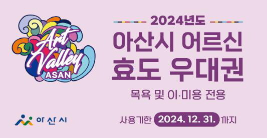 한편 시는 2011년부터 아산시에 주민등록을 두고 거주하고 있는 65세 이상 노인들의 건강과 복지 증진을 위해 ‘어르신 효도우대권 지원사업’을 추진하고 있다.