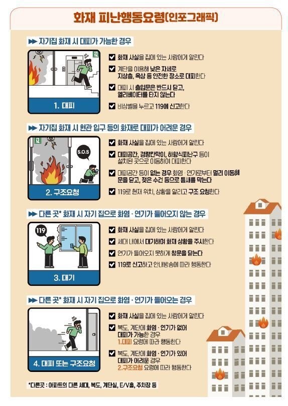 아파트는 화재 발생 시 건물 전체로 연기가 확산하기 때문에 연기(유독가스)를 피할 수 있도록 피난 시 행동요령을 숙지하는 것이 중요하다.