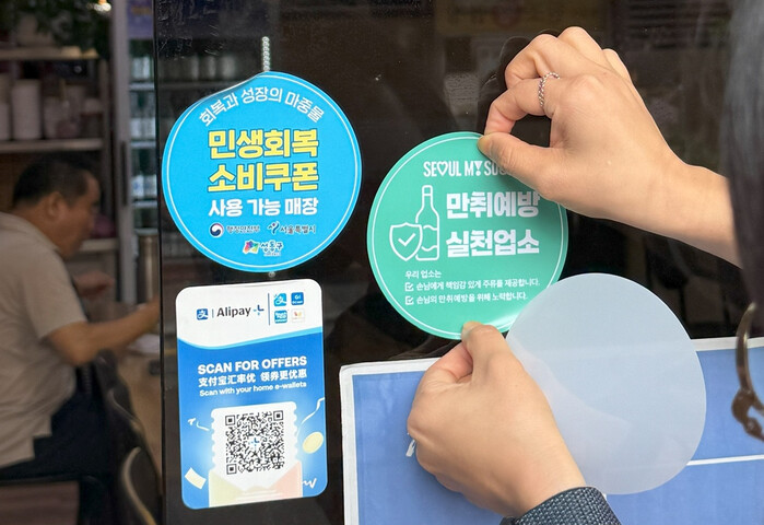 | ▲ 만취예방 실천업소 스티커 부착 모습. (사진=성동구청 제공) |