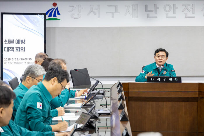 서울 강서구가 최근 진교훈 구청장 주재로 구청 재난안전상황실에서 ‘산불 예방 긴급 대책회의’를 열었다. 회의 내용은 산불 예방 대책과 주민 안전 확보를 위한 비상 대응체계 점검 등이다. 사진은 진 구청장(오른쪽)이 회의를 주재하는 모습. (사진=강서구청 제공)