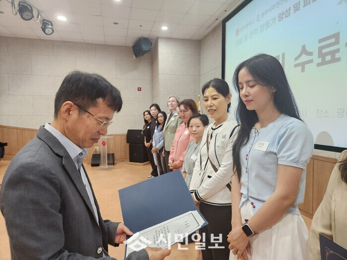 | ▲ 광주광역시, 29일 시청 무등홀에서 2025년 10개 언어권 총 16명의 의료 통번역 활동가 신규 양성과정 수료생에게, 수료증 수여 자료사진 / 광주광역시 제공 |