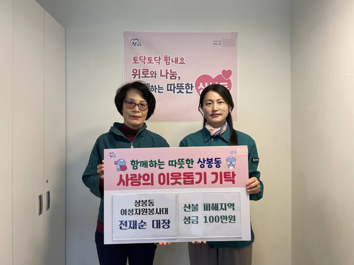 최은영 상봉동장은 “어려운 상황에도 이웃을 돕기 위해 아낌없는 관심과 지원을 보내주신 여성자원봉사대와 전재순 대장님께 감사드린다”며 “성금은 산불 피해 지역 주민들에게 소중히 전달될 수 있도록 하겠다”고 말했다.