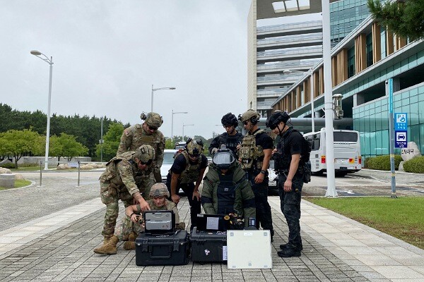 | ▲ 7월 17일부터 3일간 인천공항공사 인재개발원에서 실시한 ‘한·미 연합 폭발물 처리 훈련’에서 인천공항 폭발물 처리반 요원 및 훈련 참석자들이 폭발물 처리 로봇을 이용해 폭발물을 해체하고 있다. (사진제공=인천공항공사) |