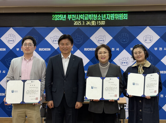 경기 부천시가 최근 조용익 시장 주재로 ‘2025년 부천시 학교 밖 청소년 지원 위원회’를 개최했다. 이번 회의는 탄소중립 실천을 위해 종이 없는 회의로 진행됐다. 사진은 조 시장(왼쪽 두 번째)이 신규 위촉된 위원들과 기념 촬영을 하는 모습. (사진=부천시청 제공)