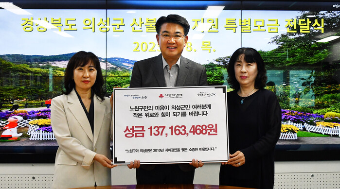 오승록 서울 노원구청장이 최근 구청장실에서 영남지역 산불 피해 이재민 돕기 성금 전달식에 참석했다. 성금은 총 1억3700여만원이 모금됐다. 이사회복지공동모금회를 통해 자매결연 도시인 경상북도 의성군에 전달될 예정이다. 사진은 오 구청장(가운데)이 관계자들과 기념 촬영을 하는 모습. (사진=노원구청 제공)