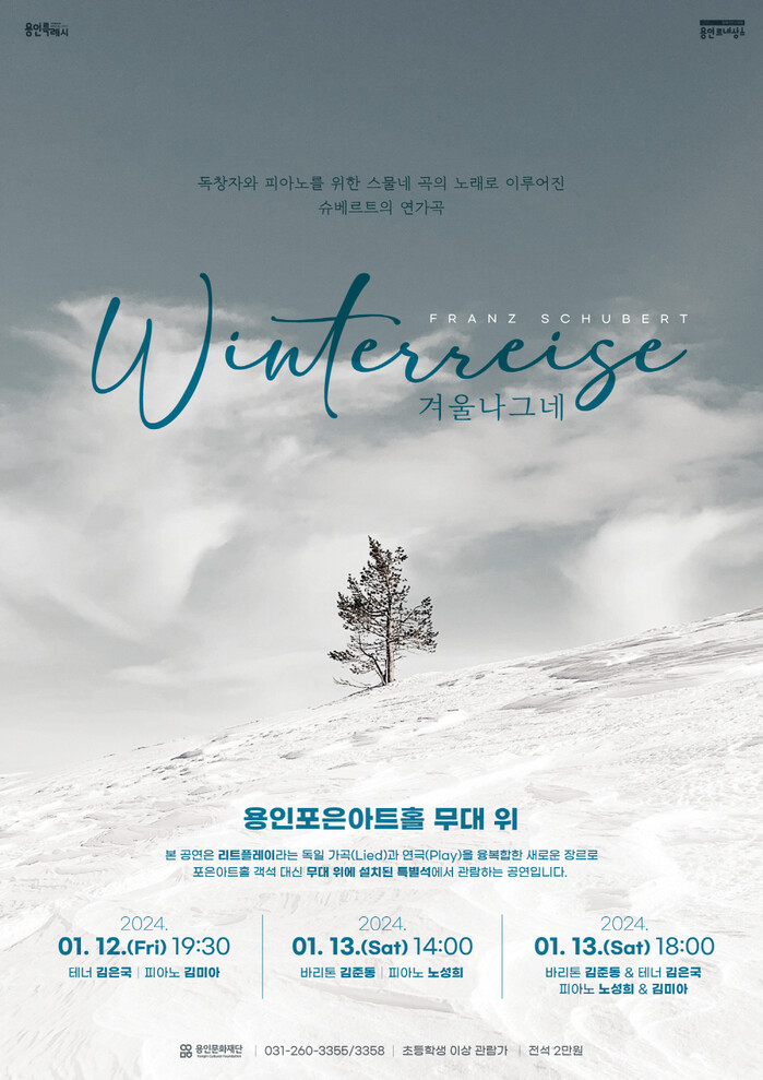 슈베르트의 연가곡 ‘겨울나그네’는 8세 이상 관람가로 티켓은 전석 2만 원이며, 용인문화재단 홈페이지와 인터파크티켓에서 예매 가능하다. 본 공연에 관한 궁금한 사항은 용인문화재단 CS센터로 문의하면 된다.