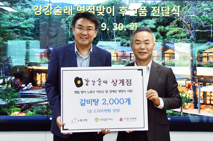 오승록 서울 노원구청장이 9월30일 구청장실에서 열린 ㈜전한 강강술래 명절맞이 후원품 전달식에 참석했다. 사진은 오 구청장(왼쪽)이 관계자와 기념 촬영을 하는 모습. (사진=노원구청 제공)