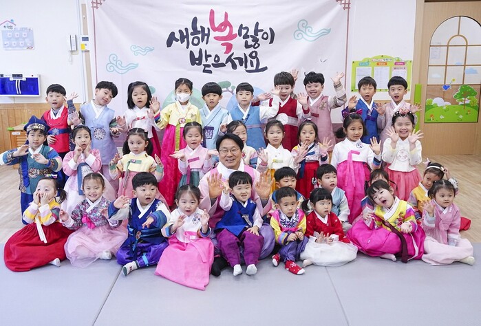 [광주=정찬남 기자] 강기정 광주광역시장이 설 명절을 앞두고 8일 오전 시청어린이집을 방문해 원생들과 세배와 윷놀이를 하며 즐거운 시간을 보낸 뒤 기념촬영을 하고 있다./광주광역시 제공
