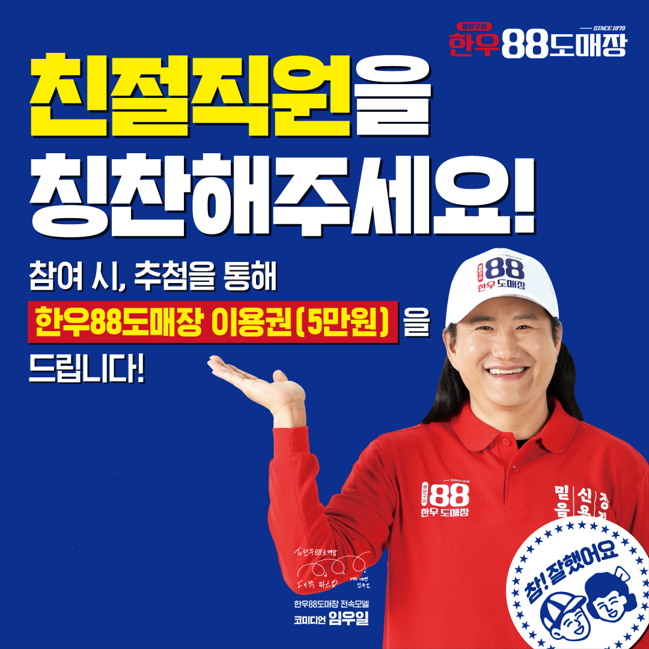 이번 이벤트는 전국 한우88도매장 매장을 대상으로 실시되며, 매장에 비치된 포스터 내 QR코드를 스캔한 뒤 방문 매장에서 친절하다고 느낀 직원을 추천하고 추천 사유를 작성하면 참여할 수 있다. 응모자 중 추첨을 통해 한우88도매장 5만 원 이용권이 제공될 예정이다.