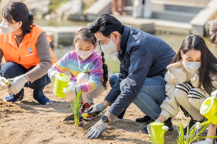 | ▲ 22일 ‘세계 물의 날’을 기념해 송파둘레길 성내천 구간에서 ‘우리 아이들에게 푸른 지구를’ 환경 캠페인이 열렸다. 사진은 박성수 구청장(가운데)이 수질정화식물 꽃창포를 심고 있는 모습. (사진제공=송파구청) |