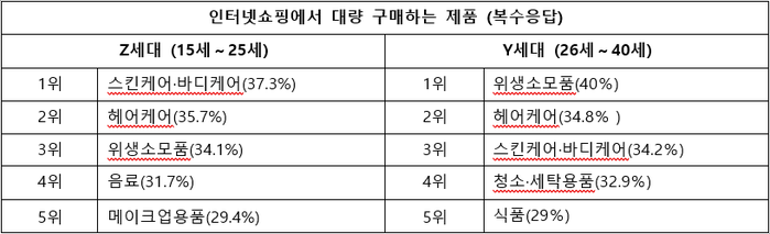 세대별로 비교하면 Z세대에서는 1~3위를 차지한 스킨케어·바디케어(37.3%), 헤어케어(35.7%), 위생소모품(34.1%) 외에 음료(31.7%), 메이크업용품(29.4%)이 각각 4위, 5위에 올라 주로 뷰티 제품을 대량으로 구매하는 것으로 조사됐다. Y세대의 경우 위생소모품(40%), 헤어케어(34.8%), 스킨케어·바디케어(34.2%)가 1~3위로 조사됐으며, 청소·세탁용품(32.9%), 식품(29%)이 5위 안에 들었다.