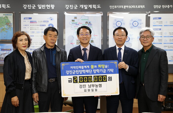 [강진=정찬남 기자] 최길선 전남 강진 남부농협 조합장과 임직원들이 최근 장학금 200만원을 강진군민장학재단에 기탁했다.