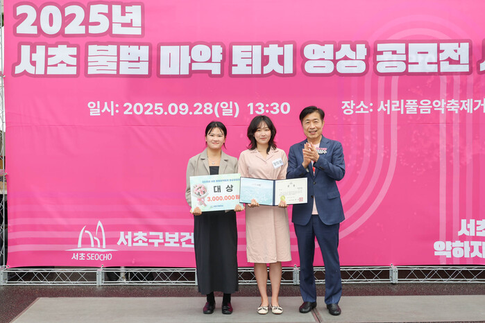 서울 서초구가 최근 서리풀뮤직페스티벌 현장에서 ‘2025년 서초 불법마약퇴치 영상공모전’ 시상식을 개최했다. 사진은 전성수 구청장(맨 오른쪽)이 대상 수상팀인 최강수아팀과 기념촬영을 하는 모습. (사진=서초구청 제공)