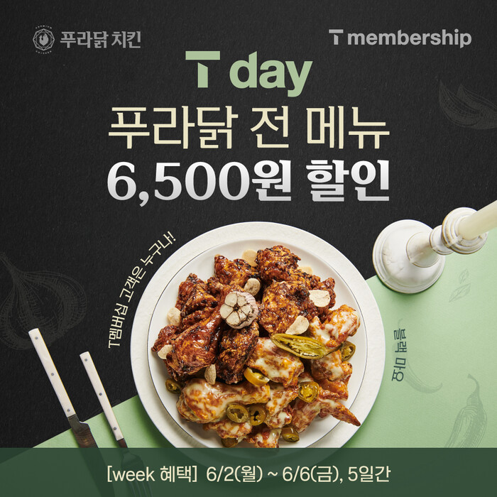 참여 방법은 간단하다. T멤버십 앱에서 할인 쿠폰을 내려받은 뒤, 푸라닭 전용 앱에서 배달 또는 포장 주문 시 해당 쿠폰을 적용하면 최대 6천5백 원의 혜택을 받을 수 있다.