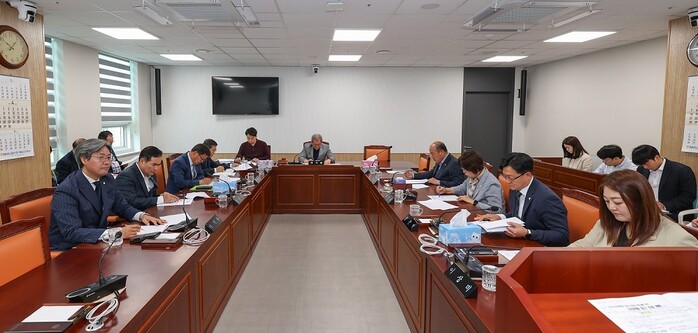 | ▲ 김석순 해남군의회 의장(사진 가운데)이 29일 군의회 운영위원실에서 열린 제6치 의원간담회에서 해남군으로부터 제출된 각종 사업제안설명서를 동료의원들과 검토하고 있다 해남군의회 제공 |