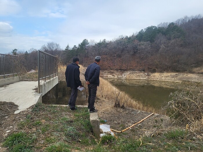| ▲ 영암군 관계자가 덕진운곡제 저수지 관리실태 안전감찰을 하고 있다. / 영암군 제공_ |