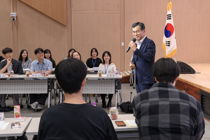 서울 양천구가 최근 양천디지털미디어센터에서 ‘2025 하반기 청년 행정인턴 근무종료 간담회’를 열어 정책 제안을 논의하고 공유하는 시간을 마련했다. 사진은 간담회에서 이기재 구청장이 인사말을 하는 모습. (사진=양천구청 제공)