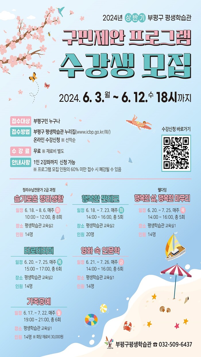 수강 신청은 부평구평생학습관 홈페이지를 통해 온라인으로 이뤄지며, 별도 수강료 없이 부평구민이라면 누구나 참여할 수 있다.