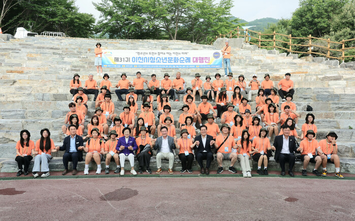 경기 이천시가 주최하고 (사)한국BBS경기도연맹이천시지회가 주관한 ‘제31기 청소년문화순례대행진’이 5일 설봉공원 대공연장에서 출정식을 개최했다. 사진은 출정식에서 김경희 시장(맨 앞줄 여섯 번째)이 기념 촬영을 하는 모습. (사진=이천시청 제공)
