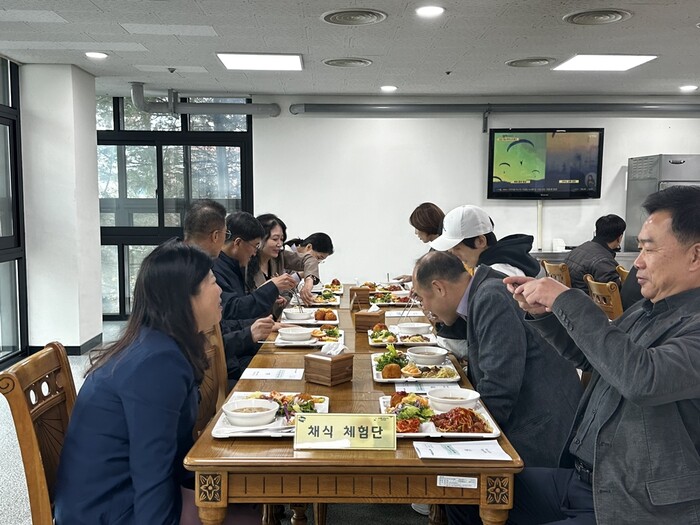 경기 의정부시는 최근 ‘채식의 날’에 지역내 환경단체 활동가들 등을 초청해 직접 구내식당 채식 요리를 제공하는 체험행사를 실시했다. 사진은 이날 참여자들이 구내식당에서 채식 요리를 먹고 있는 모습. (사진=의정부시청 제공)