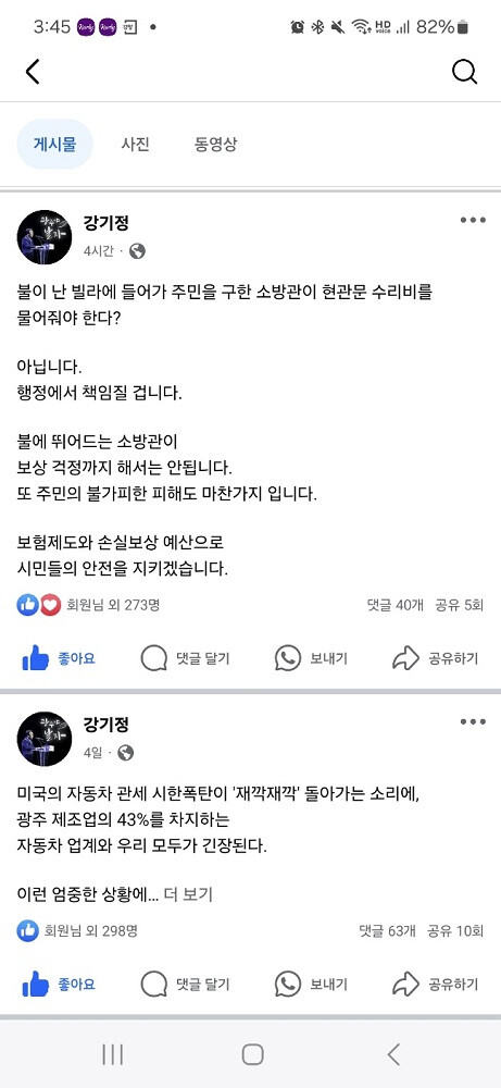 강기정 광주광역시장은 24일 사회관계망서비스(SNS)에 “불에 뛰어드는 소방관이 보상 걱정까지 해서는 안된다. 주민의 불가피한 피해도 마찬가지이다”며 이같이 밝혔다.