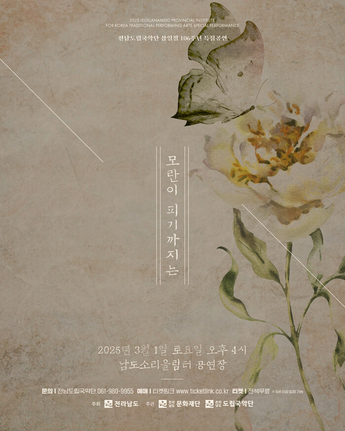 [남악=황승순 기자] 전남도는 전통음악을 보다 가치 있게 만들어가는 전남도립국악단이 오는 3월1일 오후 4시 남악 소재 남도소리울림터에서 삼일절 106주년 특집공연 ‘모란이 피기까지는’을 무료로 무대에 올린다고 밝혔다.