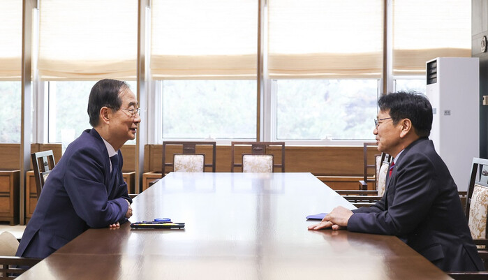 | ▲ 강기정 광주광역시장이 21일 오후 정부 세종청사에서 한덕수 국무총리와 만나 민·군공항 통합이전을 위해 범정부협의체 재개를 요청하고 있다./광주광역시 제공 |